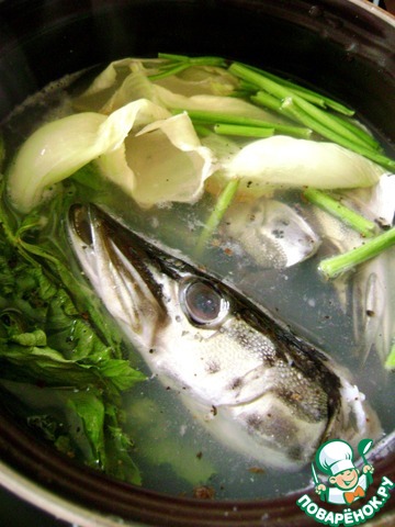 Из голов, плавников, хвостов и хребтов поставить варить бульон с луком, перцем и стеблями петрушки. Залить водой чуть выше голов и добавить белое сухое вино. Варить на медленном огне полчаса.