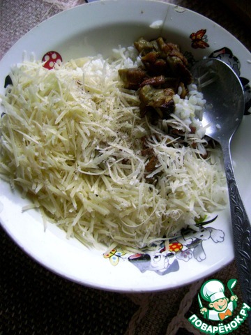 Выложить грибы в рис, добавить тертый сыр, посолить и поперчить по вкусу.