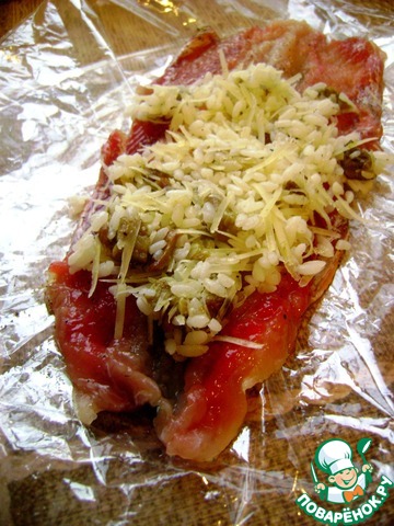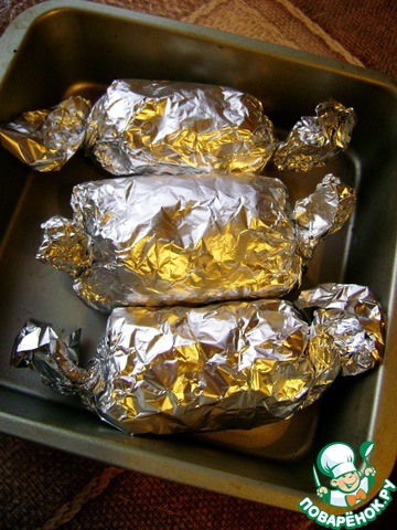 Закрутить фольгу, плотно обжимая рулеты. Уложить в огнеупорную форму и запечь в разогретой до 180 градусов духовке в течении получаса.