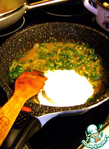 Пока щука запекается, приготовить соус. Мелок нашинкованный лук позолотить в масле, оставшемся от обжарки белых грибов. Влить процеженный бульон – 200 мл – и уварить на медленном огне вполовину. Добавить нашинкованную зелень петрушки, сметану. Размешать и прогреть пару минут. Отлить две ложки соуса в мисочку, растереть с ним сырой желток и тонкой струйкой влить в сковороду. Размешать и снять с огня.