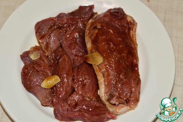 Телятину. нарезать ломтиками. Замариновать 2 вида мяса в соевом соусе, добавив пластинки чеснока. Оставить на 30 минут.
