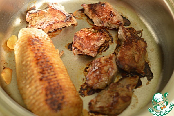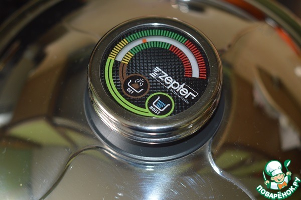 Сотейник Zepter накрыть крышкой, поставить на средний огонь. Когда стрелка термоконтроллера дойдет до середины зеленого поля по шкале Dry-выложить мясо. Я одновременно выложила утиную грудку кожей вниз и ломтики телятины. Телятина обжарилась очень быстро с одной стороны я перевернула на другую. Когда телятина была готова, я перевернула утиную грудку.