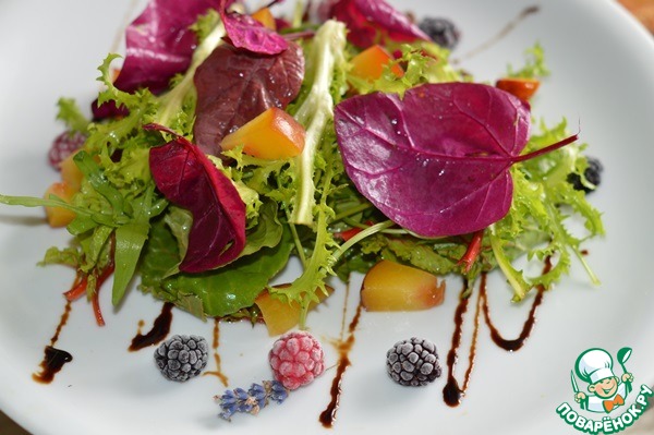 Полить сверху салат заправкой и украсить ягодами и бальзамическим кремом.