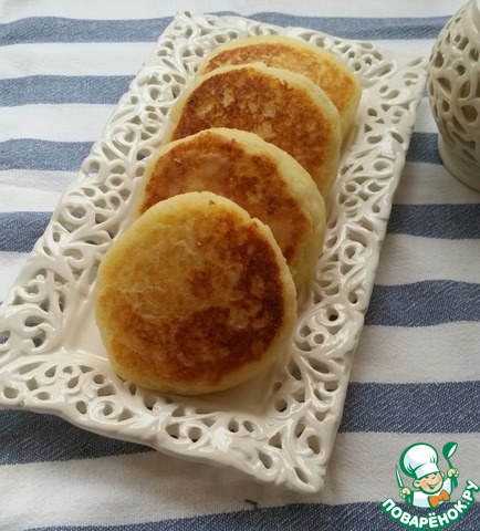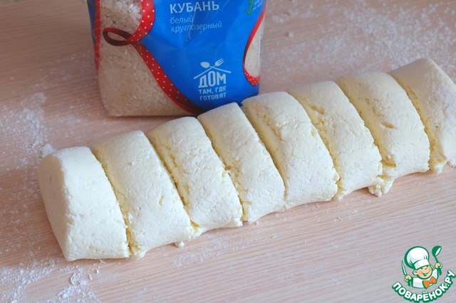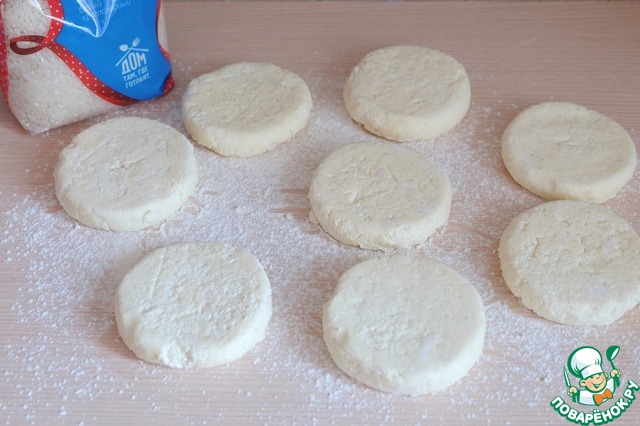 Из кусочков творожного теста сформовать лепешки, толщиной примерно 1,5 см.