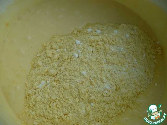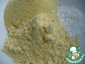 Крупу манную смешать с кукурузной мукой и разрыхлителем.
