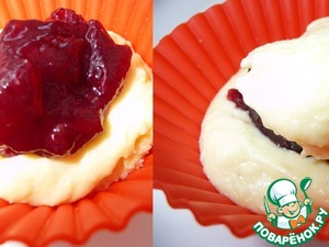 В формочки выложить 1 ст. л. теста, сверху неполную чайную ложку конфитюра, сверху снова тесто. -