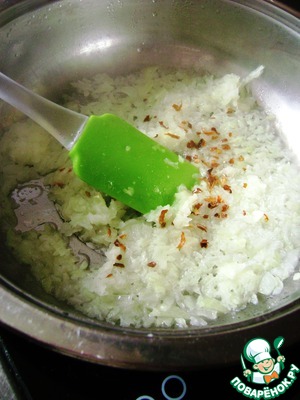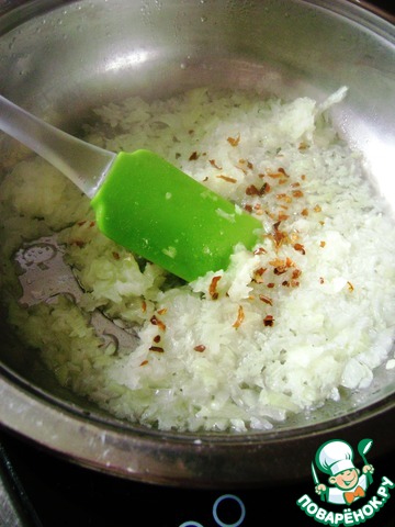 • Лук пробить блендером в крошку и спассеровать в масле до мягкости. Влить вино и выпарить его наполовину.