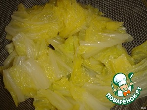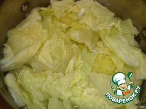 Листья капусты (у меня пекинская) нарезать поперек широкими полосками. Опустить в кипящую подсоленную воду и приварить в течение 2-3 минут.