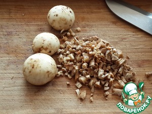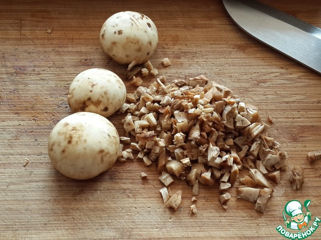 Мелко нарежьте сырые шампиньоны и добавьте к фаршу