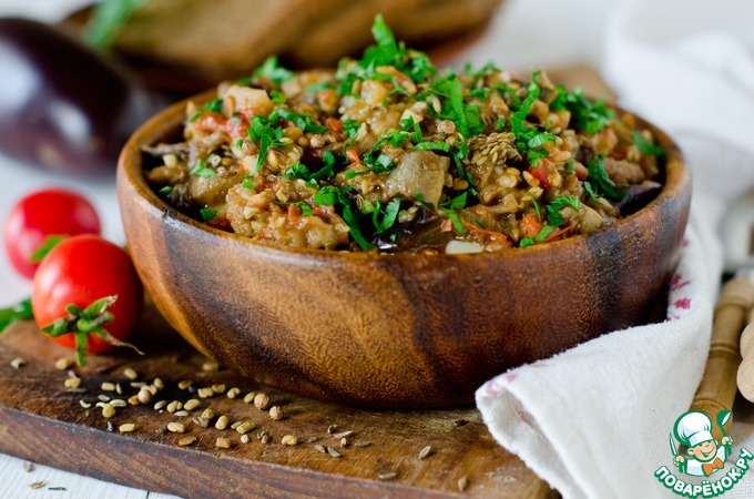 Еще одна вариация на тему баклажанной икры, но за счет интересного набора специй совсем другой вкус, прям с каким-то индийским акцентом.