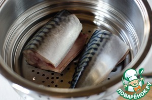 Свежую скумбрию выпотрошить, удалить голову, разрезать напополам и уложить в пароварку Zepter. Так как в системе Zepter можно готовить сразу несколько блюд и запах одного блюда не передается другому, то для экономии времени, можете готовить сразу два блюда, как это сделала я, в кастрюле у меня варился картофель и после приготовления он совсем не пах рыбой.