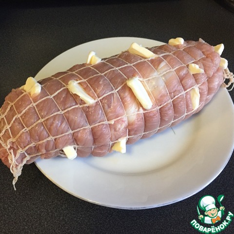 Кусок телятины моем, вытираем насухо бумажным полотенцем, делаем надрезы и вставляем кусочки сливочного масла.