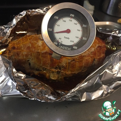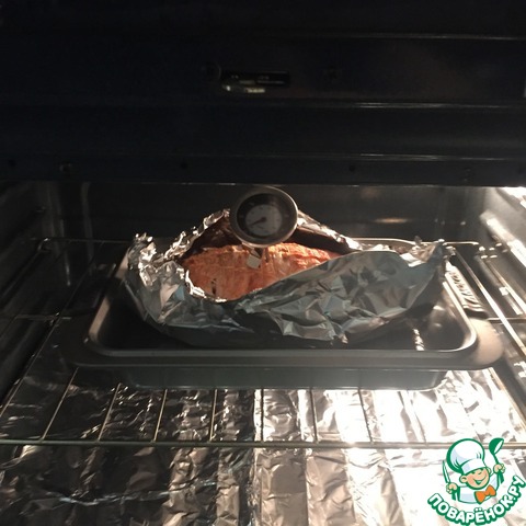 Затем открываем фольгу, вставляем термометр и ставим обратно в духовку ещё минут на 15.
