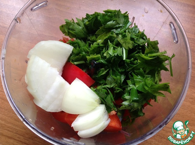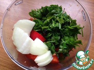 Перец и лук очистить, нарезать произвольно кубиками и выложить в чашу блендера. Туда же отправляем зубчик чеснока и нарезанную петрушку. Пюрируем.