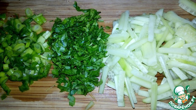 Огурцы вымыть, нарезать соломкой. Зелёный лук и петрушку промыть, обсушить и порубить.