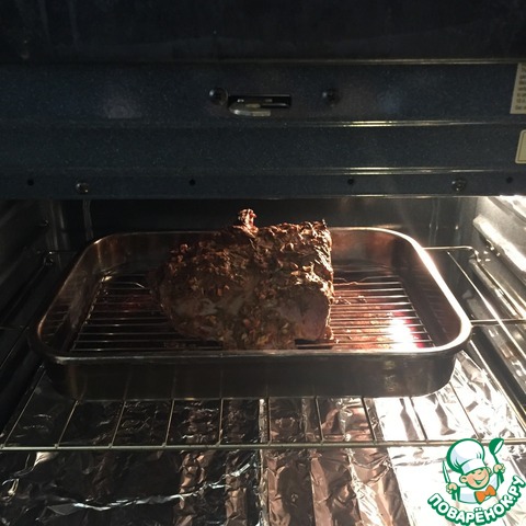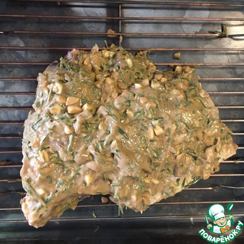 Баранью ногу хорошо смазываем маринадом, кладём в огнеупорную форму на решетку и даём постоять 30 минут, что бы она пропиталась маринадом.