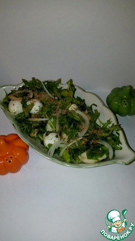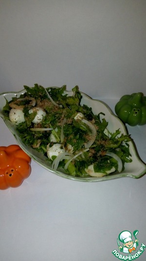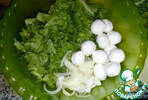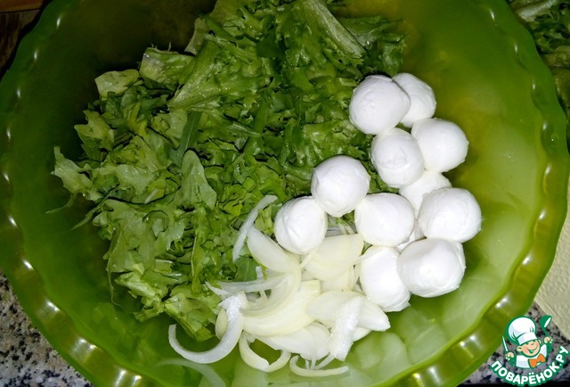 Лук, зелень, моцареллу и яблоко полить заправкой, аккуратно перемешать и дать постоять 10 минут.