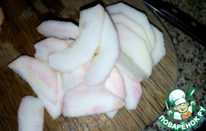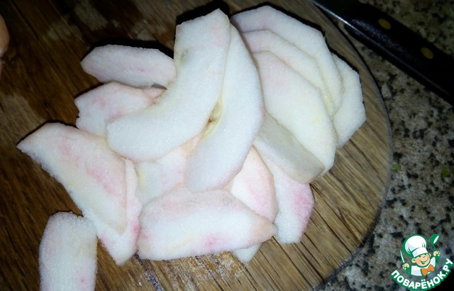 Яблоко очистить, нарезать тонкими ломтиками и сбрызнуть соком лимона.