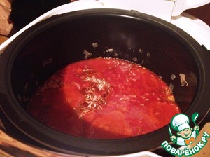 Влить томатный сок. Посолить, всыпать паприку. Включить режим "Плов" Готовить до окончания режима.