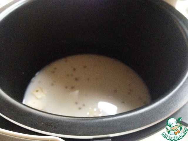 Влить воду, молоко, добавить масло, нарезанное кусочками и соль. Перемешать. Включить режим "Каша" на 40 минут.