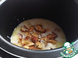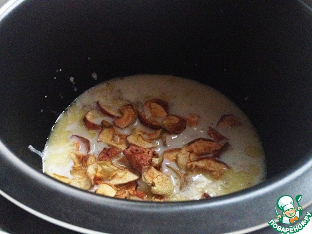 Сухофрукты помыть. Курагу и чернослив порезать. Спустя 10 минут добавить их в чашу мультиварки