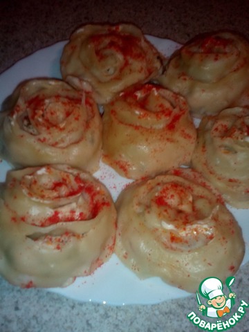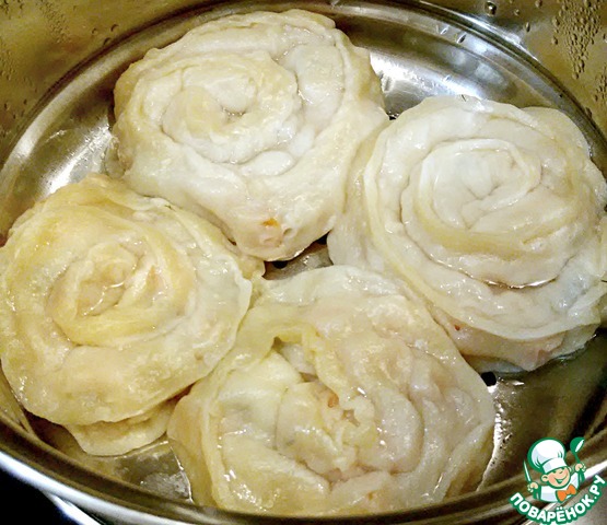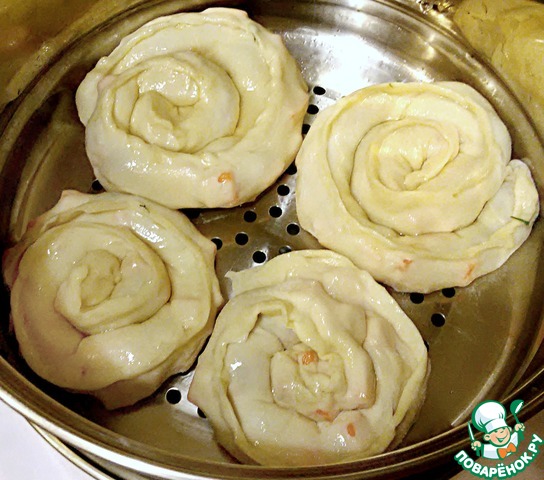 "Розочки" выложить в пароварку, сверху смазываем растительным маслом и готовим на пару 40 минут.