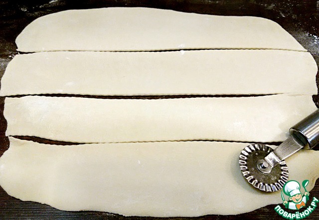 Взять одну часть, а остальные убрать в полиэтилен, чтобы не засыхало. Раскатать тонко (~25*20) и разрезать на 4 полоски. -