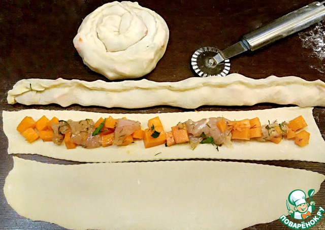 В середину по всей длине каждой полоски положить столько начинки, чтобы можно было слепить края.