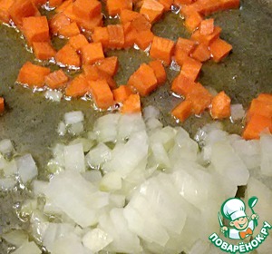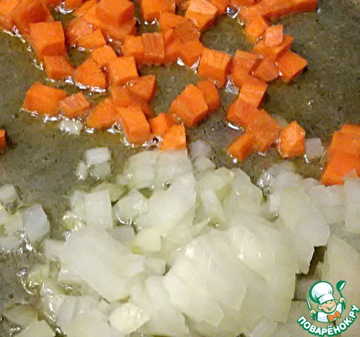 На сковороде растопить сливочное масло, обжарить лук с морковью и добавить в кастрюлю с картофелем.