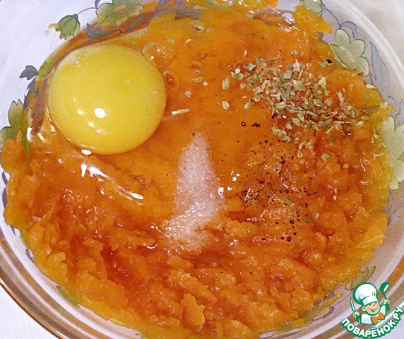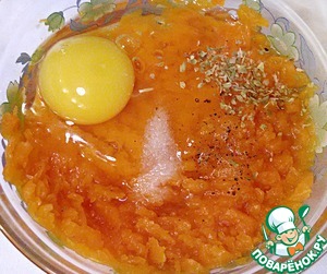 Тыкву отварить до мягкости и размять вилкой. Добавить яйцо, соль, перец, орегано и перемешать.