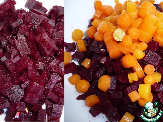 Свеклу и морковь (у меня морковь консервированная) нарезать небольшими кубиками. -