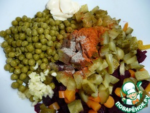 Добавить зеленый горошек, смесь перцев, выдавить чеснок. Заправить майонезом.