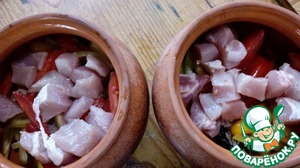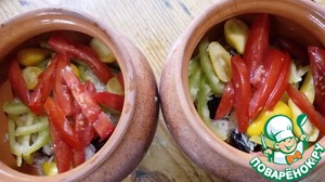 Складываем овощи в горшочки.