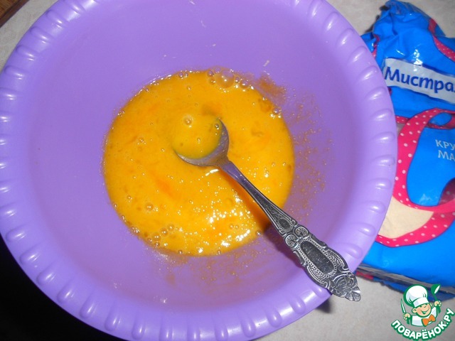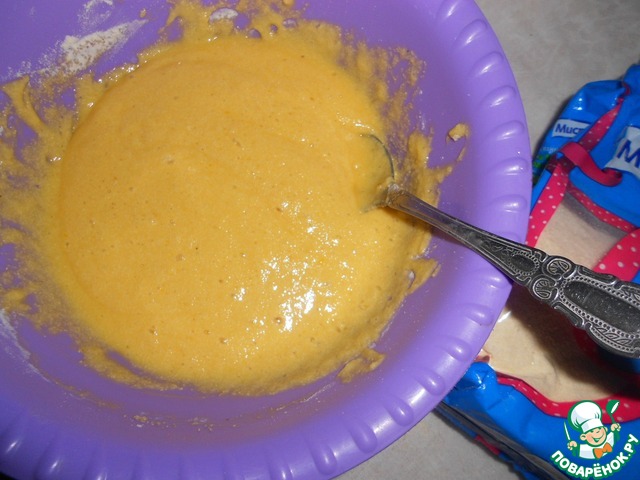 • Добавить посеянную муку с разрыхлителем, манную крупу Мистраль, кефир. Перемешать до однородной массы. Тесто в силиконовую формочку для выпечки.