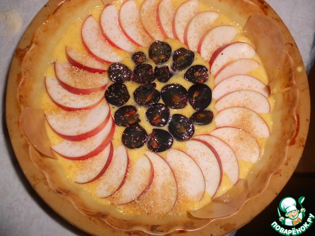 • Яблоко нарезать тоненькими дольками, выложить на тесто. В середину выложить виноград, нарезанный на половинки. Сверху посыпать тростниковым сахаром.