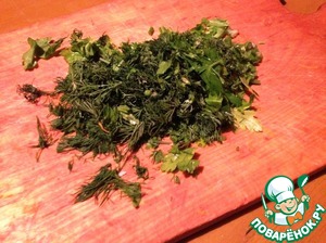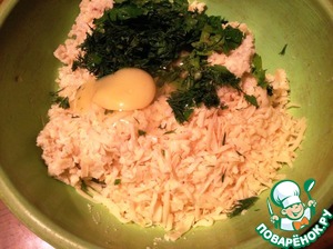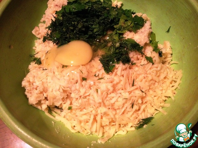 Добавить в остывшую кашу сыр, зелень и яйцо. Перемешать. -