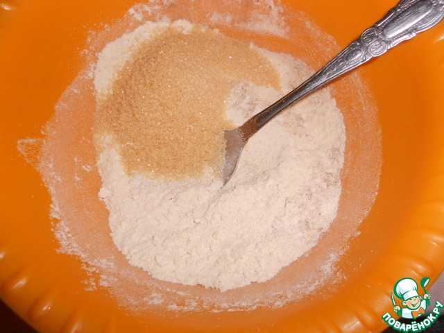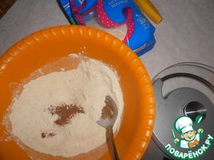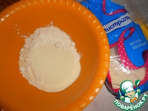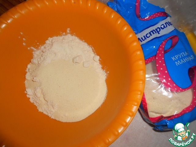 В миске соединяем муку с манной крупой и разрыхлителем.