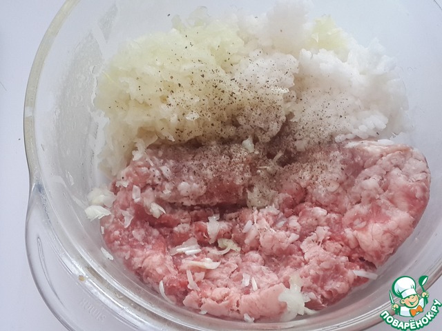 К мясному фаршу добавьте измельченный лук, рис, соль и перец.