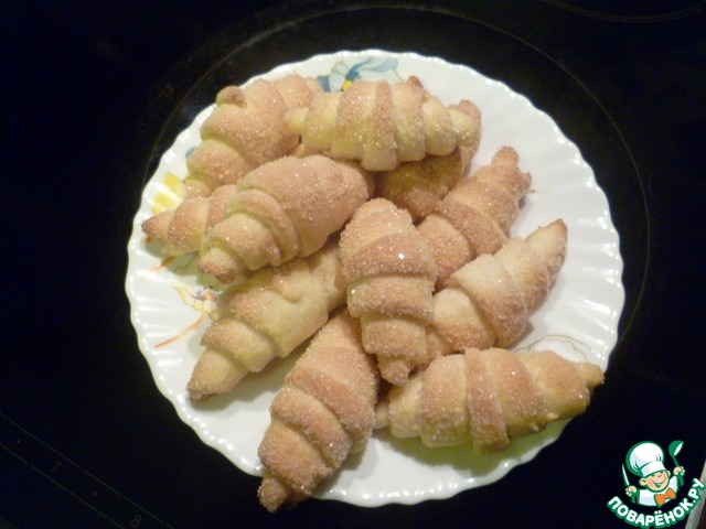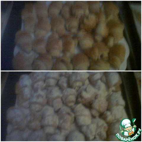 Перед отправлением в духовку, рогалики смазываем смесью: 1 желток + 2 ст. л. молока + 1 ч. л. сахара и затем присыпаем сахаром, можно маком или рубленными орехами. -