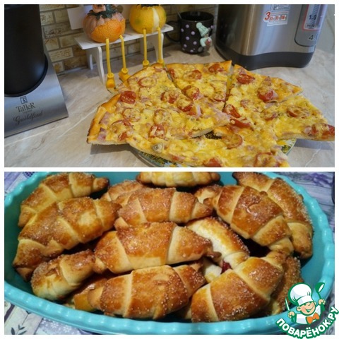 Берём один шарик теста из холодильника (остальные ждут своей очереди в холодильнике) и раскатываем его в круг диаметром 28 см, разрезаем на 16 сегментов и сворачиваем каждый в рогалик (рабочую поверхность припыляем мукой).