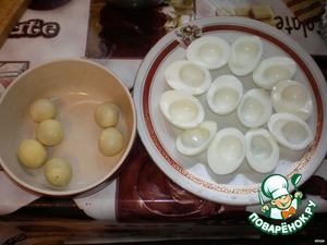 Отварить яйца, почистить. Разрезать вдоль. Вынуть желтки.