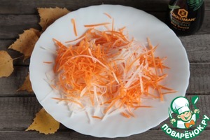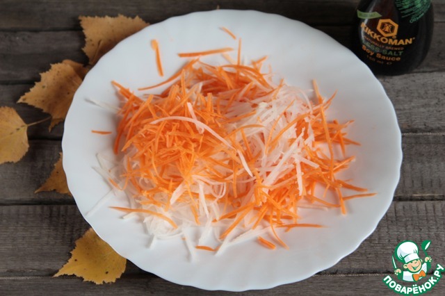 • Морковь и дайкон натереть на терке для корейского салата.