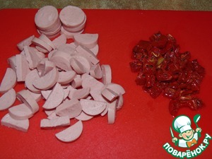 Добавить порезанные сосиски и вяленые томаты.