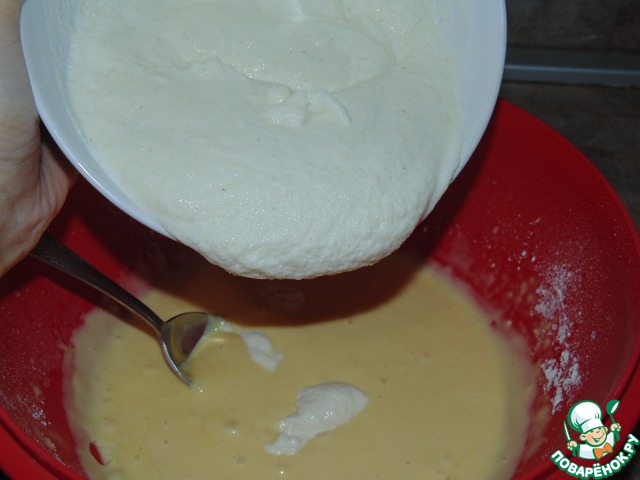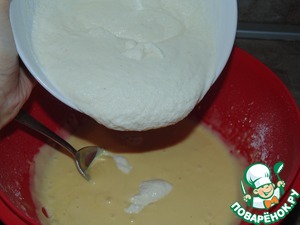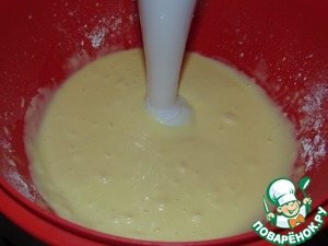 Добавить растопленное сливочное масло. Постепенно всыпать муку и разрыхлитель.