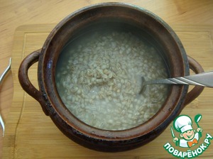 Параллельно ставим на плиту перловку. Соотношение воды к крупе-3 стакана воды к 1 стакану перловки. Доводим её до кипения и варим минут 15. Потом выкладываем в горшок. У меня есть такой замечательный горшок суздальской чернолощённой керамики. Такая еда в нём получается вкусная. 100 % экологически чистый продукт. Горшок на 2 л.