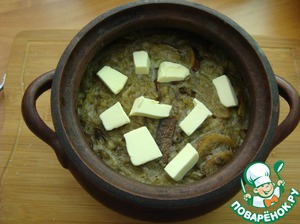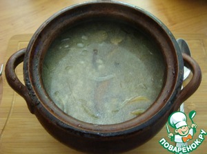 Выливаем 1 л грибного бульона. Перемешиваем и ставим в духовку. Температуру выставляем 200 С. Когда жидкость в горшке начнёт кипеть, убавляем температуру до 110 С. Делаем 1 час.