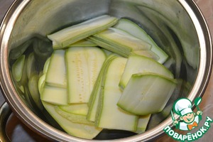 Положить на середину каждого кабачка начинку и свернуть в рулетик.