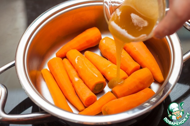 Когда приготовится морковь (она не должна быть очень мягкой), выплесните воду из сотейника, переложите туда готовую морковь, полейте заправкой, закройте крышкой и встряхните пару раз, чтобы вся она покрылась медовой глазурью. Оставьте морковь под крышкой еще на 10-15 минут, периодически встряхивая ее. Поскольку любая посуда Zepter обладает термоаккумулирующим трехслойным дном, морковь промаринуется быстрее и останется теплой до подачи, несмотря на то, что посуда не стоит на плите.