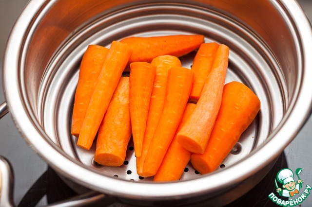 Налейте в сотейник Zepter стакан воды, поставьте сверху пароварку. Морковь очистите, положите в сито пароварки, крупную на дно, мелкую сверху. Если мини-морковь найти не удалось, ничего страшного - нарежьте на толстенькие кружочки обычную морковь.