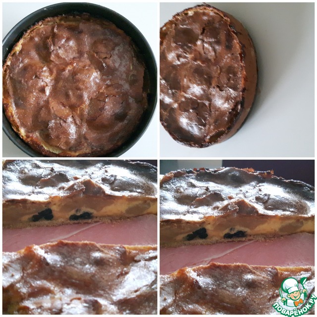 Остальное тесто раскатать между пленкой тонко, выложить на заливку, защипнуть хорошо края - я раскатывала по кусочкам и выкладывала как бы заплатками.